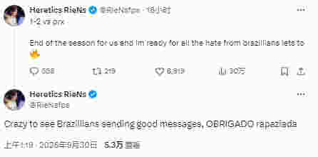 2025全球冠军赛淘汰赛TH 1-2 PRX,止步六强。赛后,RieNs发文,大意如下: