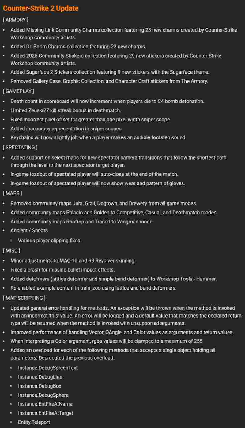恰逢CS2发布两周年之际,开发人员推送了一波不小的更新。本次更新带来了武库系统中的全新挂饰、社区新地图以及地图脚本的调整等内容。