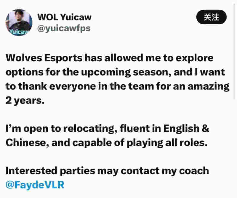 Huang Yung-chieh (黃湧傑) | Yuicaw今日在社交媒体发文,确认已获得俱乐部许可,可以在转会期内公开寻找新队伍。他表示自己愿意接受调动,能够使用中英文沟通,并能胜任所有位置。有意向的队伍可联系其教练