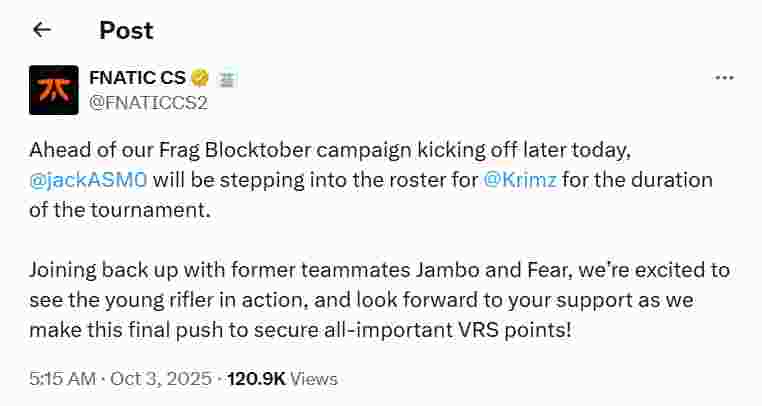 今日凌晨,fnatic在社媒上宣布前Passion UA选手jackasmo将代替KRIMZ参加Fragadelphia Blocktober赛事。该赛事是fnatic竞争布达佩斯Major席位的最后机会。