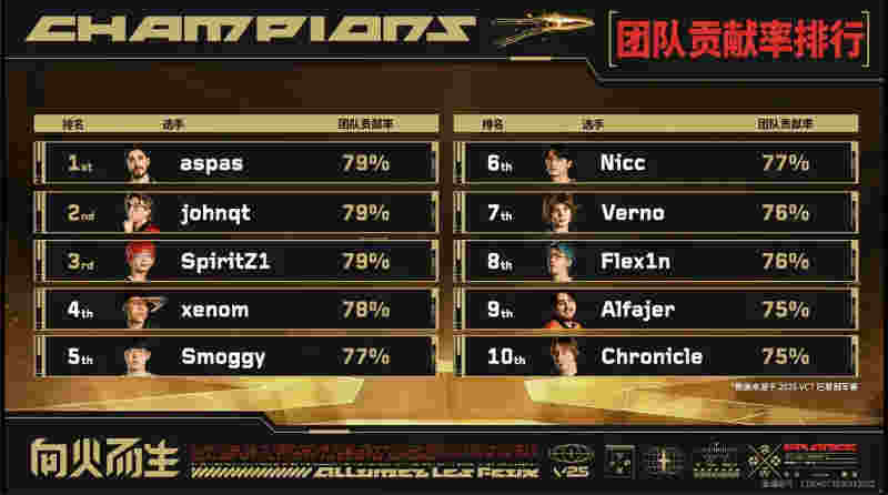 今天官方直播流中给出了冠军赛截至目前团队贡献率的排行榜单,其中Erick Santos | aspas位列第一,CN赛区共有四人上榜,分别是