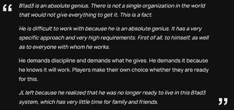 “jL的离开,是因为他意识到自己再也无法适应B1ad3的体系。在这个体系里,留给家人和朋友的时间少之又少。”