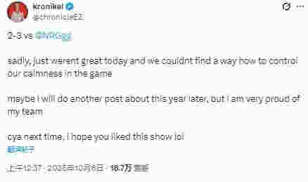 赛后,Timofey Khromov | Chronicle发文,大意如下:2-3 NRG,很可惜今天表现不好,我们无法在比赛中保持冷静。