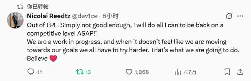 “我们从EPL出局了。就是表现不够好,我会拼尽全力,尽快回到竞技水平!