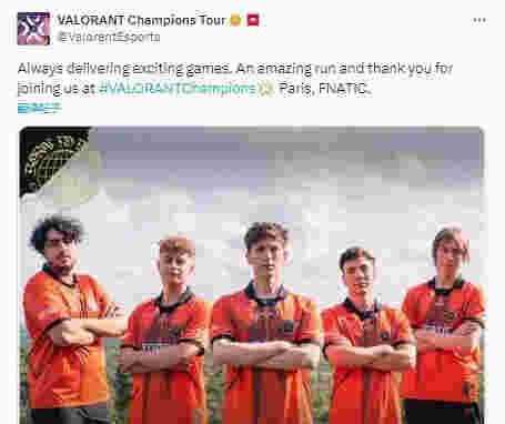 赛后,VCT官推致谢FNC:始终呈现出精彩的比赛。感谢FNC参与2025巴黎全球冠军赛,你们的这段旅程非常精彩。