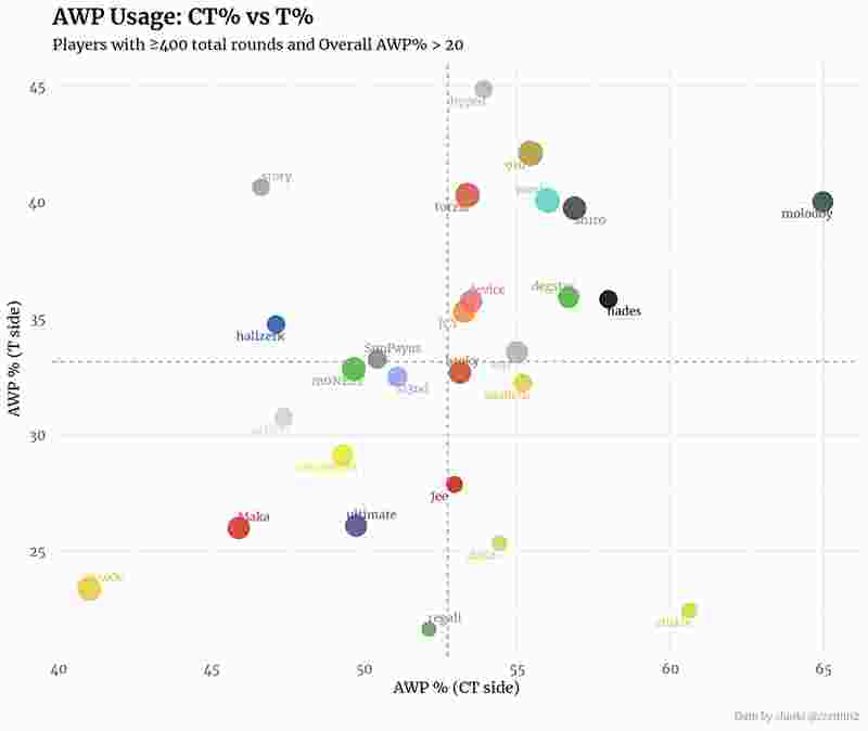 分析师还展示了不同选手在CT方和T方使用AWP的分布情况。ZywOo和molodoy再次处于相反的极端。最具侵略性的AWP使用者包括hyped、910、story、torzsi和hallzerk。