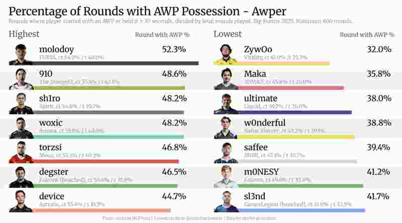 CS2爱好者对比了2025年大型赛事中狙击手使用主武器AWP的时间,发现ZywOo的使用率最低,而molodoy的使用率最高。该数据由用户clu0ki发布在社交平台上。