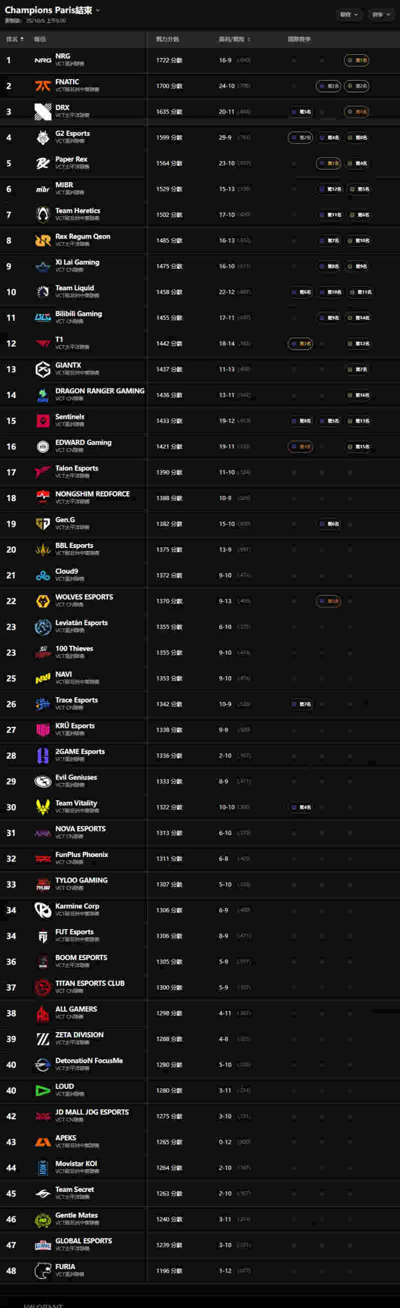 2025全球冠军赛已经落下帷幕,拳头VCT网站今早更新了最新的全球赛区&战队战力排行榜(排名为今年成绩):