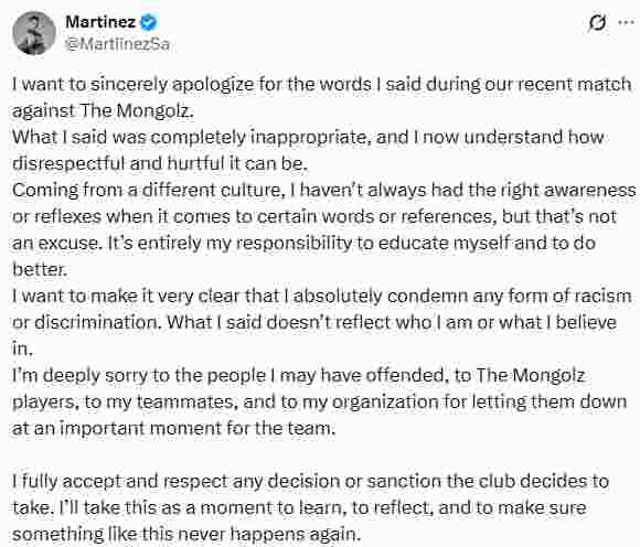 “我谨就近期对阵The Mongolz比赛中的言论致以诚挚歉意。我的言论完全失当,如今我深刻认识到其不敬与伤害性。