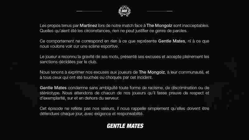 MartinezSa所在的俱乐部也在社交平台上发文表示,该选手已认识到自己言论的严重性。目前MartinezSa已致歉,并完全接受Gentle Mates战队对其作出的处罚决定。