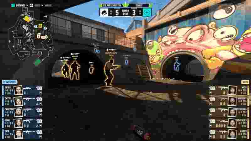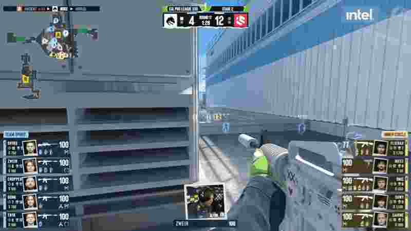相较于前两个对手,G2的实力明显更强。在这轮对抗中,tN1R继续驻守A点,此次与sh1ro(截图中标注为1号选手)搭档,必要时会支援小路。整体战术无新意,仍是沿用旧方案,子弹纷飞间,数据不断累积,回合接连拿下。