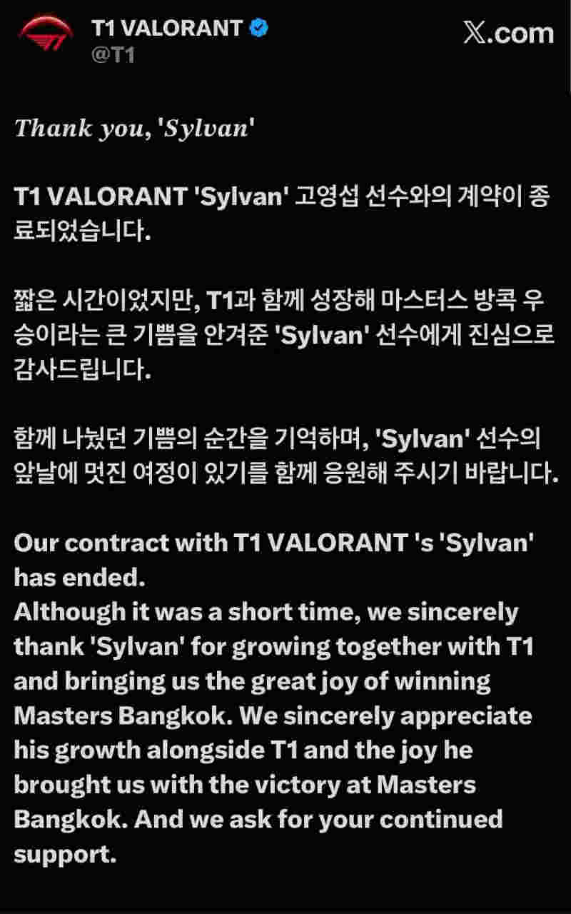 感谢你,Sylvan。T1 VALORANT选手Sylvan与俱乐部的合约已正式结束。