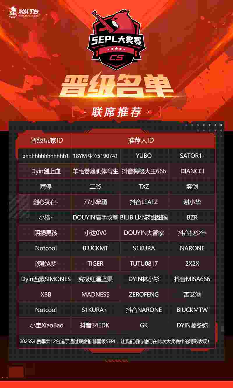 目前赛事名单正处于公示阶段,此名单将于 10 月 13 日最终敲定:2025S4 5EPL-C 晋级名单公示期开启