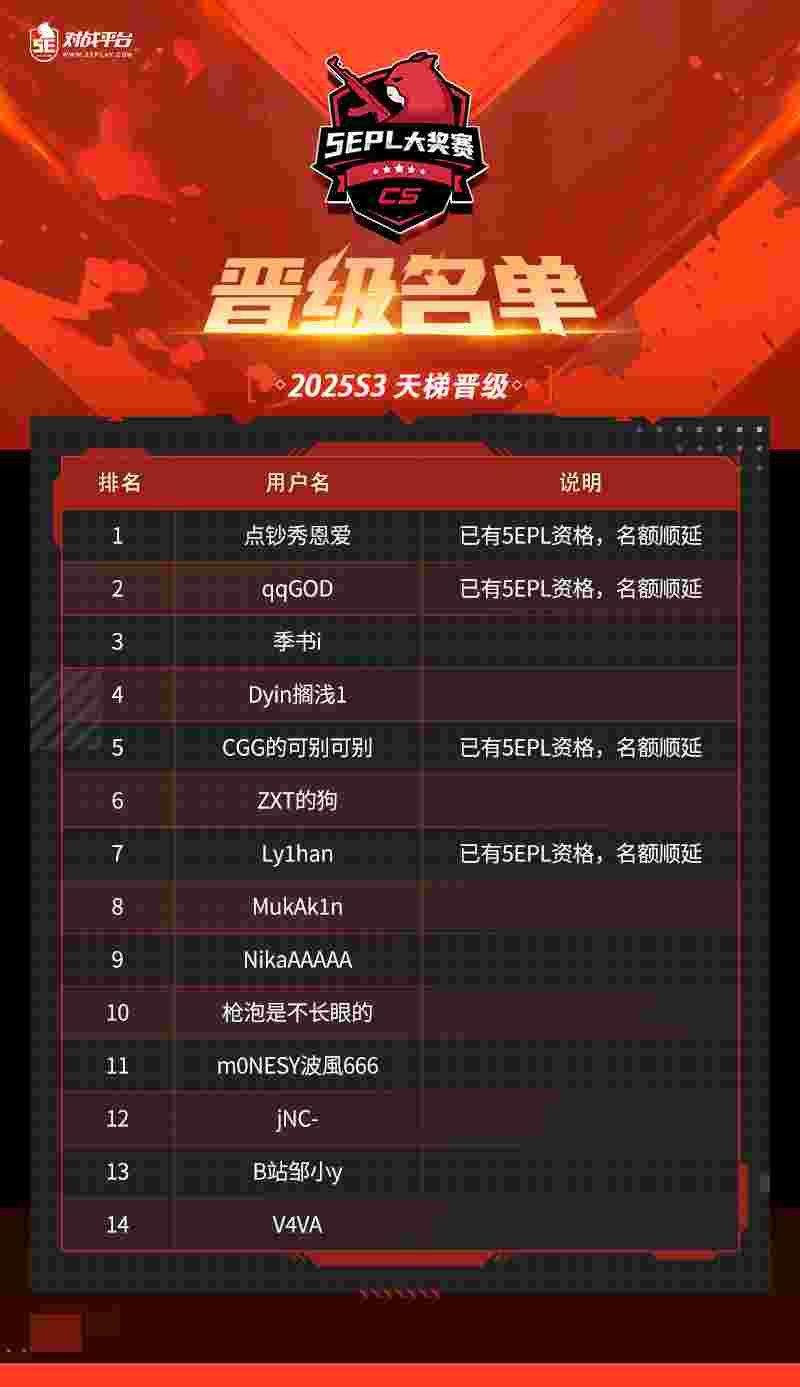 此外,在 5E 对战平台 2025S3 赛季排名前十的玩家,也凭借出色的表现直接晋级新赛季 5EPL: