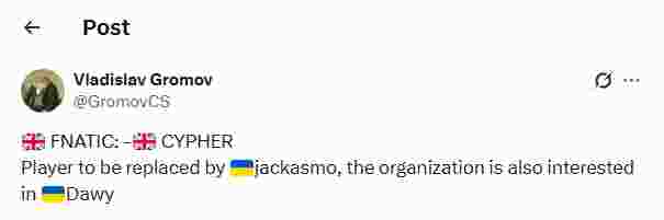 据Gromov爆料,fnatic将下放CYPHER。CYPHER的位置将由jackasmo替代,同时fnatic对Dawy也表现出了兴趣。