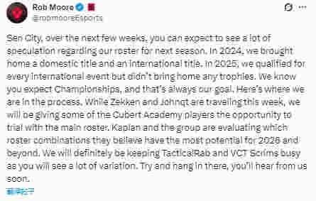 Sentinels的CEO发文,队伍将为2026赛季开启试训工作,大意如下: