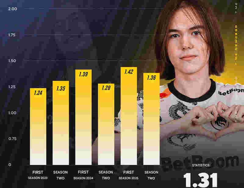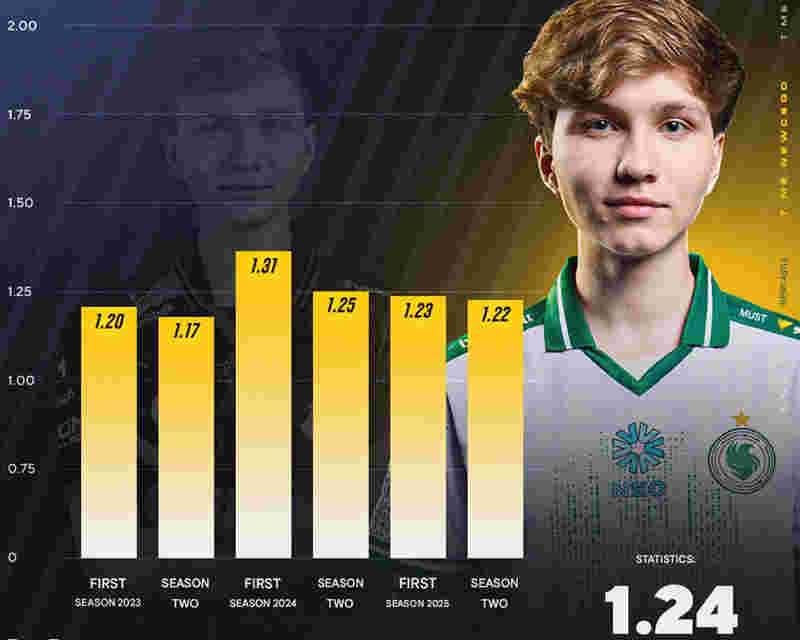 donk在2025上半赛季打出的1.42恐怖数据,打得各路对手心悦诚服。然而,随着下半年赛事的开启,他在下半赛季的Rating“回落”到了1.36。数据印证了社区的观点,在群星璀璨的阵容中,donk的个人数据有所“牺牲”,也许他不再需要像过去那样以救世主的姿态扛起队伍。