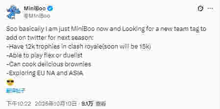 所以现在我只是MiniBoo了(ps.推特名字去掉了TH前缀),在寻找下个赛季能加在推特上的队伍tag: