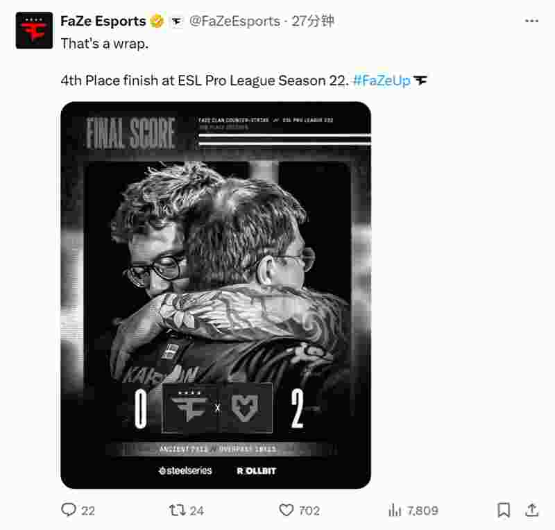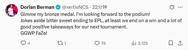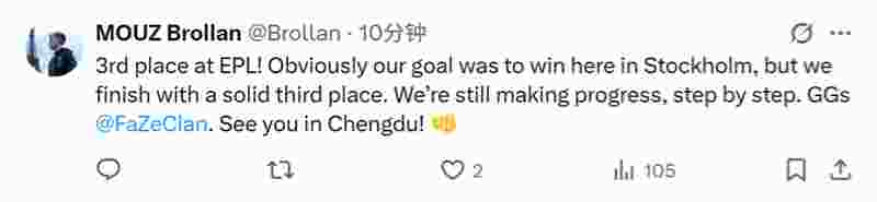 Brollan:EPL第三名!我们的目标是在斯德哥尔摩夺冠,但我们最终稳居季军。我们还在进步。GG FaZe 。成都见!