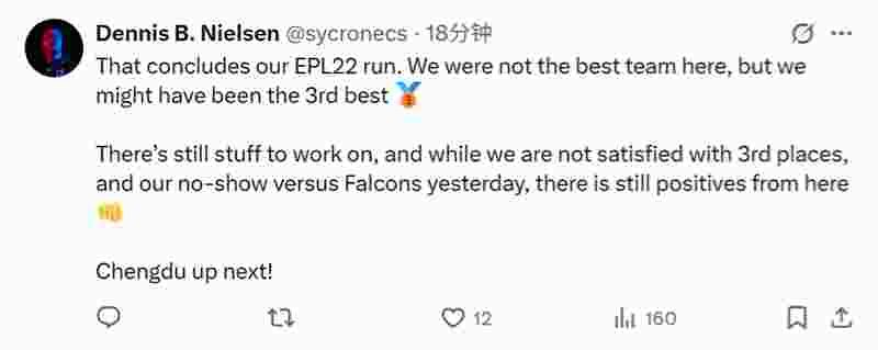 sycrone:我们的EPL S22征程到此结束。虽然算不上本届赛事最强的队伍,但我们或许能排到第三名。
