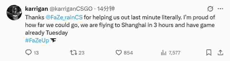 karrigan:感谢rain在最后一刻伸出援手。能走到今天我非常自豪,三个小时后内飞往上海,周二就要有比赛了。