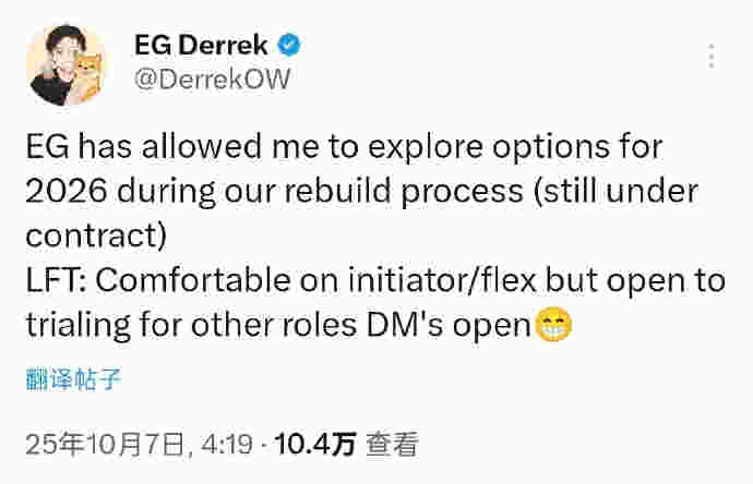 Derrek Ha | Derrek宣布在EG战队重建期间,战队已允许他为2026年寻求其他机会(目前仍在合约期内)。