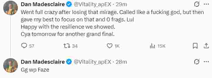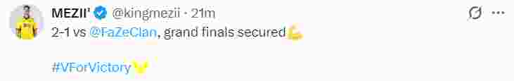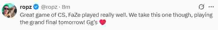 FaZe成功晋级总决赛,而FaZe则进入季军赛组争夺第三名。赛后,双方队员纷纷在个人社交频道中分享了自己的感受。