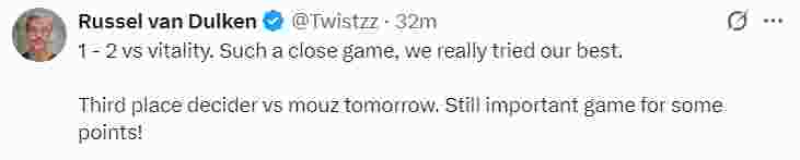 Twistzz:1比2憾负Vitality。比赛打得非常胶着,我们真的竭尽了全力。明天将与MOUZ争夺季军。为了积分排名,这仍是关键一战!