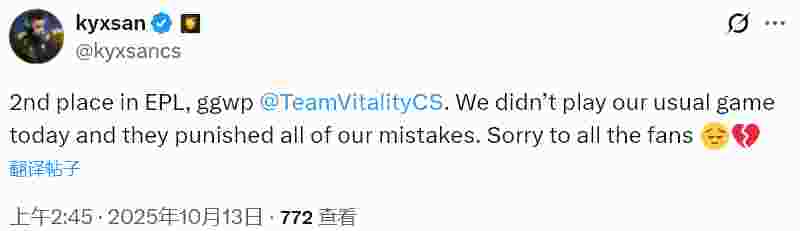 kyxsan:在EPL中获得第二名,ggwp Vitality。我们没有发挥出平常的实力,然后错误就惩罚了我们。对支持我们的粉丝表示歉意。