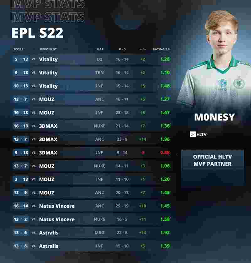 m0NESY在EPL S22出战的15张地图中,仅在四分之一决赛对阵3DMAX的Inferno中打出了低于1.00 rating的数据,其余场次均贡献了不俗的表现。其中在同一场对阵3DMAX比赛的Ancient地图中打出了1.96的最高rating表现,而在总决赛的比赛中,m0NESY同样表现出色,图一对阵
