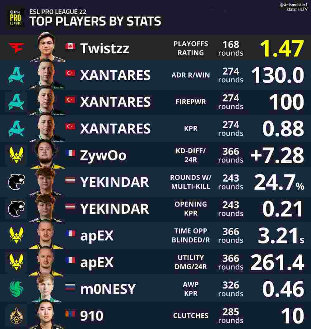此外,YEKINDAR则是在回合多杀率(24.7%)、平均每回合开局击杀次数(0.21)占据榜首。Vitality指挥apEX则是展现了其专业辅助作用,在平均每回合闪光致盲时间(3.21秒)和平均每24回合道具伤害(261.4)方面霸榜。
