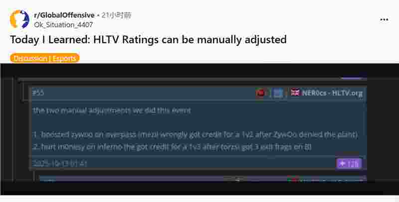 在HLTV作出解释后,用户进一步质疑其Rating系统的透明度,任何手动修改都可能影响数据真实性及观众对比赛的认知。截至本文发布时,相关讨论帖已获得449次点赞,可见社区对此事的关注度极高。