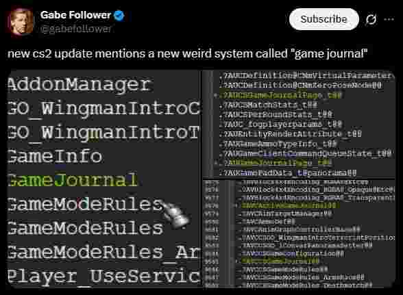 今日凌晨,Valve发布了一个更新引擎代码、边拆边架枪调整的游戏更新。但数据挖掘者Gabe Follower发现了关于未来可能发生更多变化的信息,Gabe Follower在CS2的文件中发现关于“游戏日志”的参考信息。