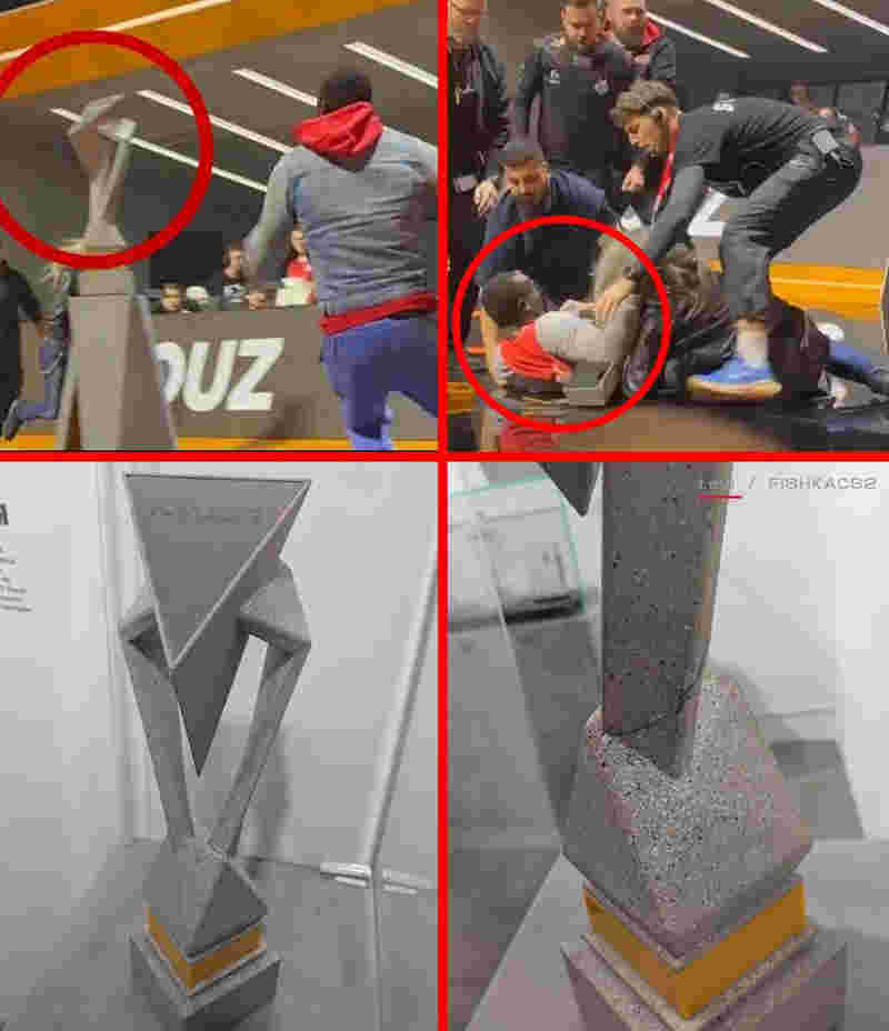 MOUZ的比赛中,一场抗议活动,演变成了一场舞台骚乱。在抗议者冲上舞台后,安保人员与闹事者发生了激烈的肢体冲突。混乱中,一名抗议者重重地摔在了奖杯之上,将其当场砸成了两段,这一幕也成为那届Major最不光彩的印记。