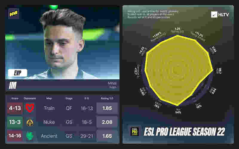 自从NAVI引入makazze后,iM便很好地适应了新的自由人角色,而本次EPL S22也是他2025年表现最佳的赛事他获得了1.25的Rating。