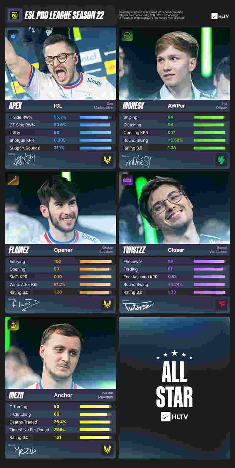 m0NESY获得MVP意味着同为狙击手的ZywOo无缘全明星阵容,apEX所在的Vitality战队仍凭借flameZ和mezii的入选,满额拿下三个全明星席位。