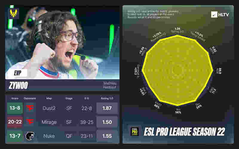 ZywOo在四分之一决赛对阵FURIA时表现出色,他获得了1.29的Rating,半决赛对阵FaZe时发挥更佳,获得了1.54的Rating,并且一如既往地拿到了1.05的获胜回合击杀和+2.75%的swing引领队伍获得胜利。