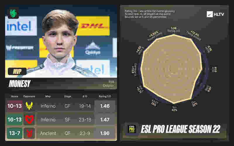 这种团队均衡发挥无突出选手的局面,也为更依赖单一明星选手的战队创造了争夺MVP机会,本赛事中最典型的便是Falcons的m0NESY。凭借在总决赛中的更优表现,以及在获胜回合中更强的影响力,他的Rating最终比ZywOo高出0.1,这帮助他拿到了最后的MVP头衔。