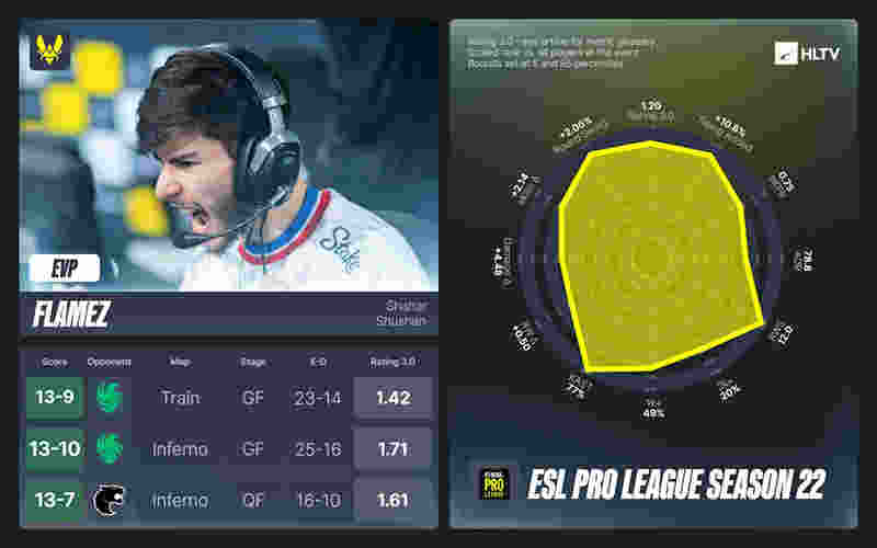 XANTARES的情况与donk类似,尽管他所在的队伍未能晋级淘汰赛,但他在小组赛阶段表现出色,他获得了1.24的Rating,获胜回合中也发挥亮眼。不过他的赛事记录中负场较多,且对阵TOP10战队时仅取得1.14的Rating,最终同样无缘EVP。
