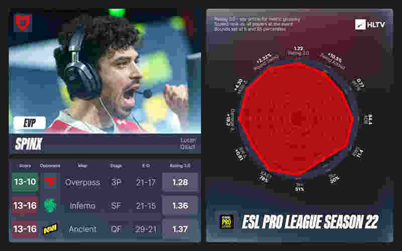 MOUZ一贯采用集体发力的团队打法,这种风格常让他们错失个人奖项,但Spinx在EPL中证明,只要打出1.22的Rating和1.03的KPRW,仍能达到EVP的评选标准。