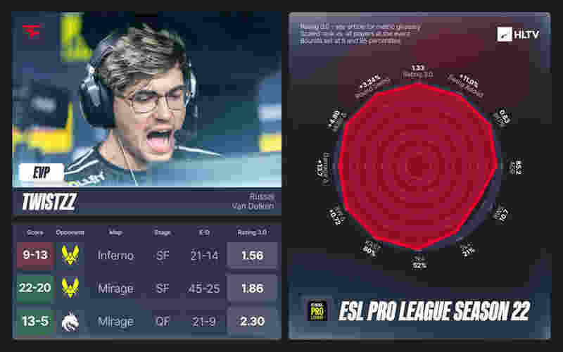 Twistzz重返FaZe战队后的首秀表现堪称完美。他以1.33的Rating结束了本次赛事,淘汰赛的Rating更是高达1.47,位列赛事第一。