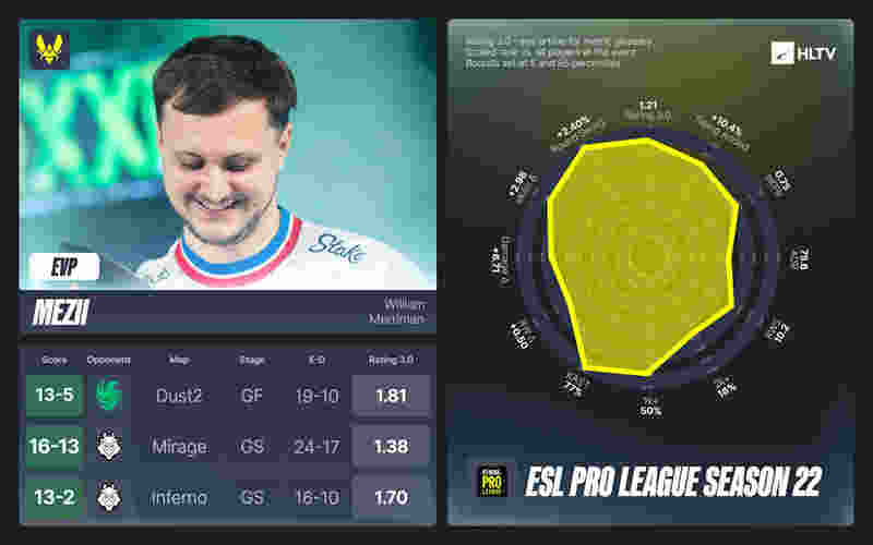 mezii是Vitality战队四名核心火力手中控场空间最少的一位,但他仍成功成为战队小组赛阶段表现最佳的选手他获得了1.33的Rating和98.8的ADRW。