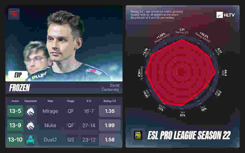 Twistzz主导了半决赛,但在此之前frozen的影响力丝毫不逊于他这位加拿大队友。frozen是FaZe小组赛阶段表现最佳的选手,在对阵Aurora的晋级生死战中,他打出了关键的1.58 Rating,而在四分之一决赛爆冷击败Spirit的比赛中,他更是在Nuke上以27杀14死、1.99 Rating的惊艳表现,为FaZe战队开启了胜利之门。