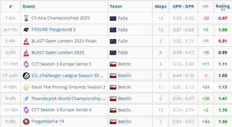 另外值得注意的是,jcobbb在老东家习惯结构化战术,依赖预设配合与明确指令;但FaZe的打法更强调自由决策,需要队员主动创造机会。Twistzz的成功正是源于对这种风格的适应。对刚加入的jcobbb而言,这种转变难度极大:他在防守方仅0.77的rating(进攻方0.95),暴露了他在自主判断防守站位、应对突发情况上的短板,而Twistzz所谓战术手册不熟的解释,无法掩盖其在防守方的核心问题。
