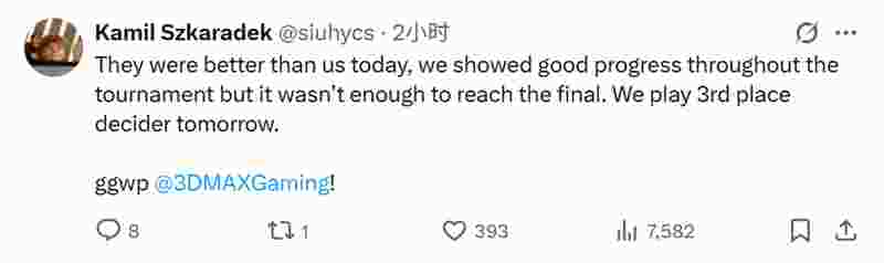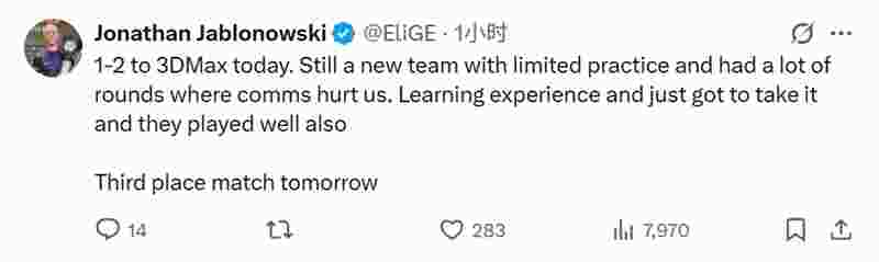 EliGE:今日1-2不敌3DMAX。我们仍是一支新组建的队伍,训练时间有限,而且很多回合中因沟通问题吃了亏。这是一次宝贵的学习经历,只能坦然接受结果。当然,对手打得也确实出色。