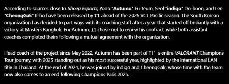 自2022年5月以来,Autumn一直担任T1的主教练,并参与了T1的所有VCT旅程。2025年是他最成功的一年,在泰国赢下国际赛冠军。2024年底,indigo和CheongGak加入,在2025年巴黎冠军赛之后他们也离开了。