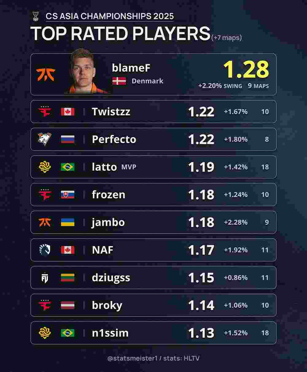 其中,fnatic战队选手blameF在9张地图中平均打出1.28 Rating高居榜首。遗憾的是,在小组赛发挥亮眼,先后战胜
