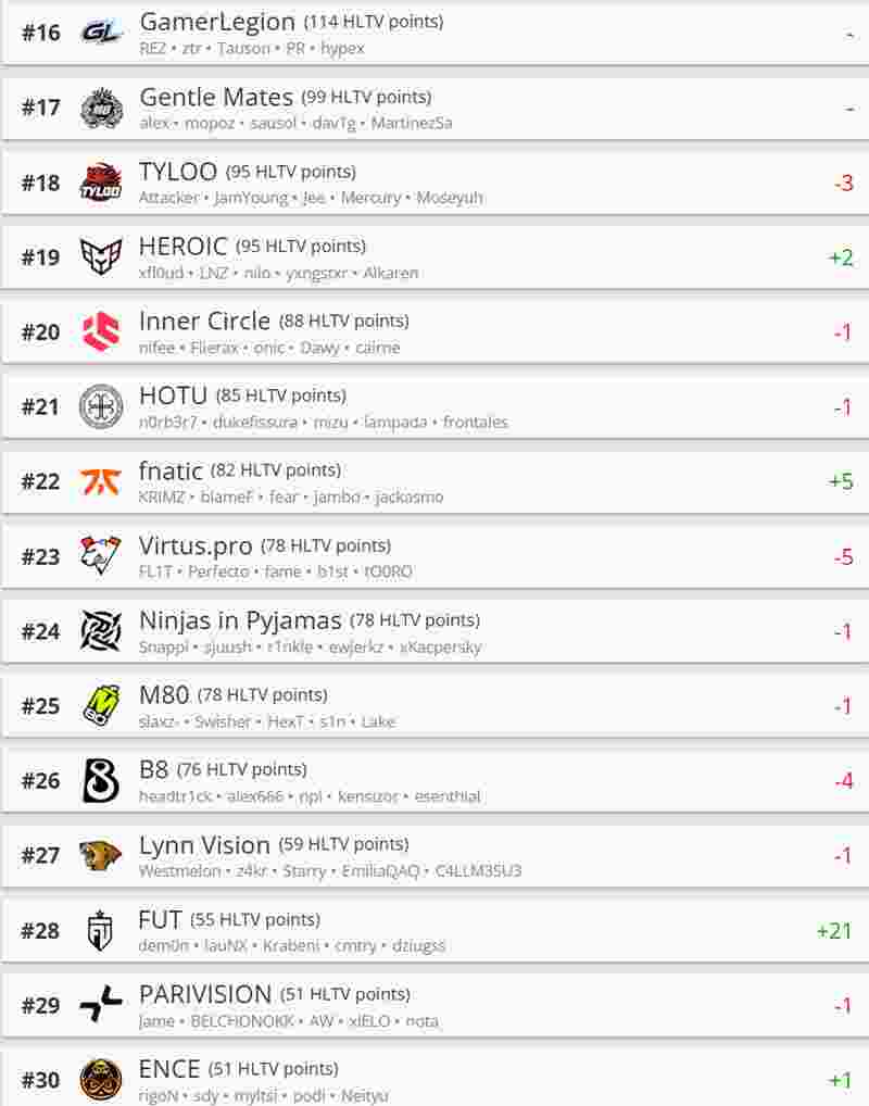 21-30名fnatic和FUT分别进步五位和21位,