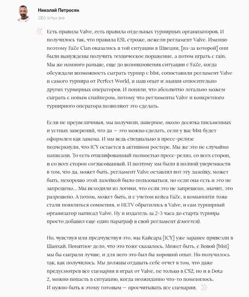 Virtus.pro的CEO就CAC 2025的人员替换事件表示:“我们的逻辑很简单,只要规则不禁止,那就意味着允许。”
