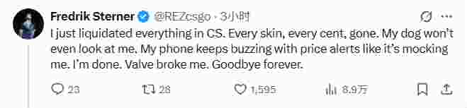 REZ:我刚刚清掉了CS里的所有东西。每一个皮肤,每一分钱,全没了。我的狗都不肯正眼瞧我。手机不停地弹出价格提醒,简直像在嘲讽我。我受够了。Valve把我搞垮了。永别了。